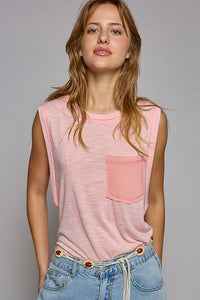 Round Neck Sleeveless Pocket Front Solid Top in Blush